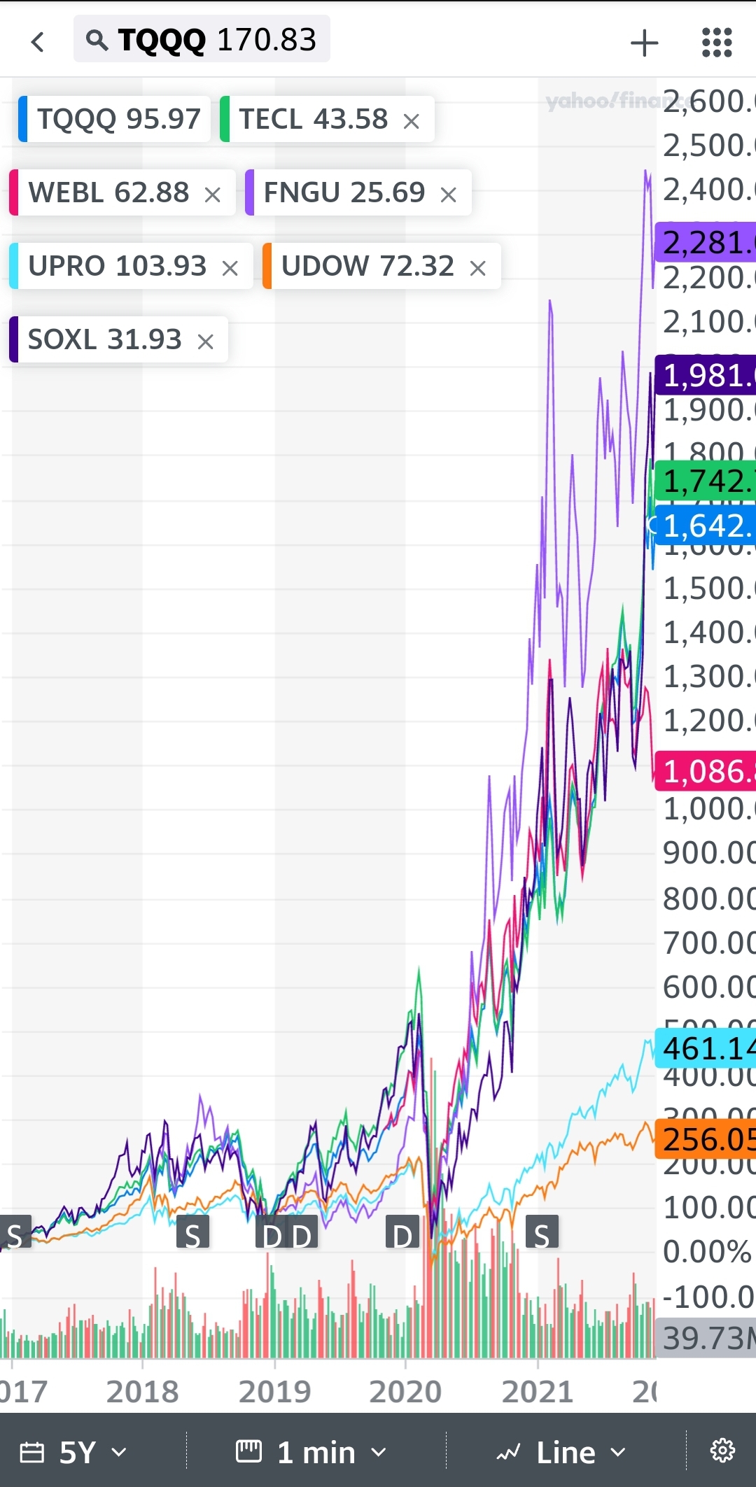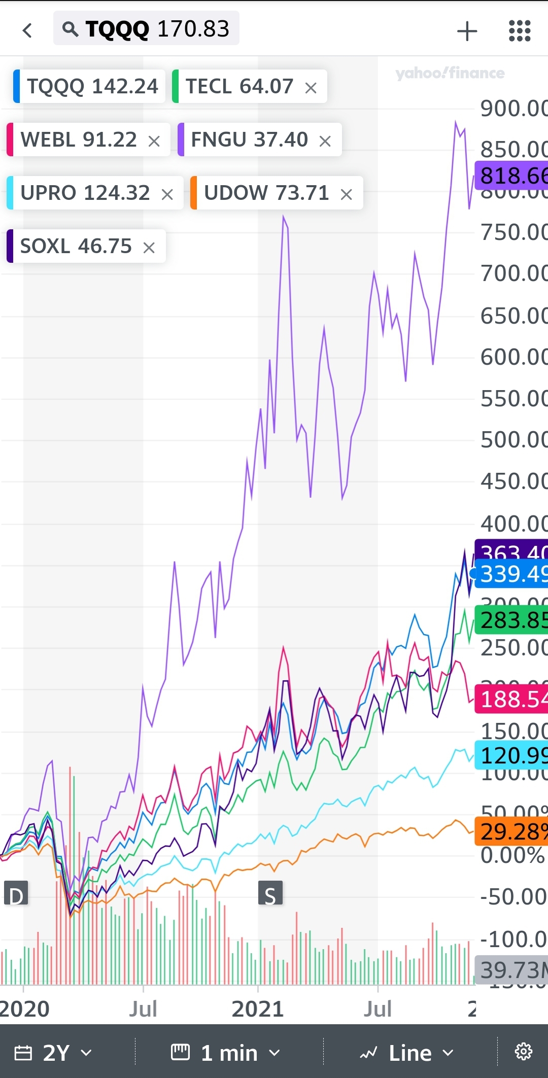 Soxl tecl tqqq 미국펀드 수익률 비교 fngu udow upro webl