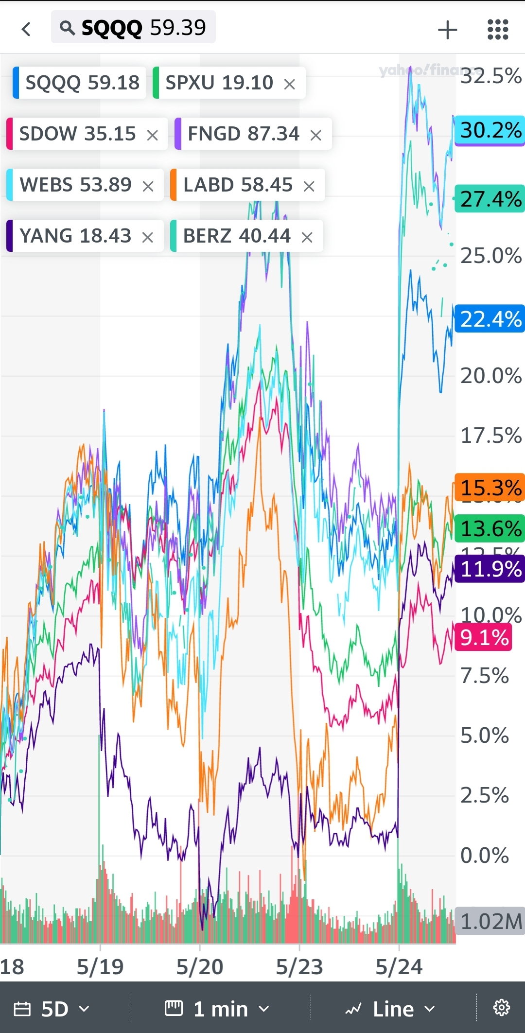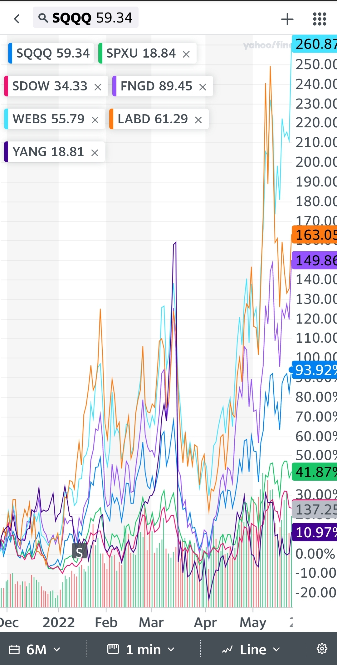 수익률 비교 sqqq spxu sdow fngd webs labd yang 인버스 하락 배팅 미국 주식
