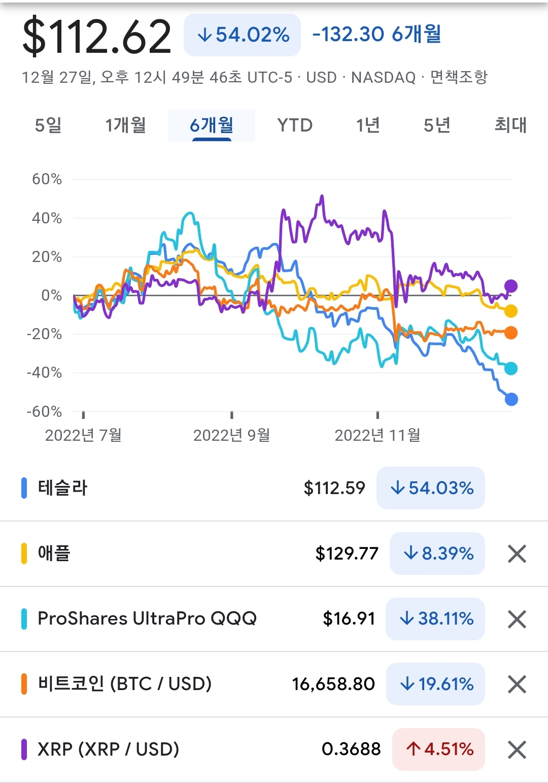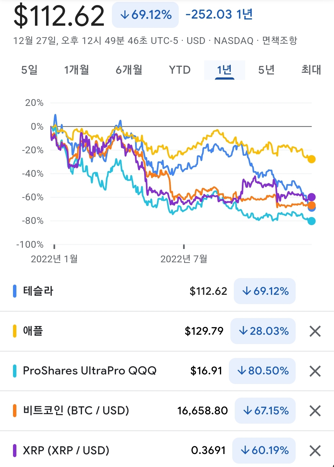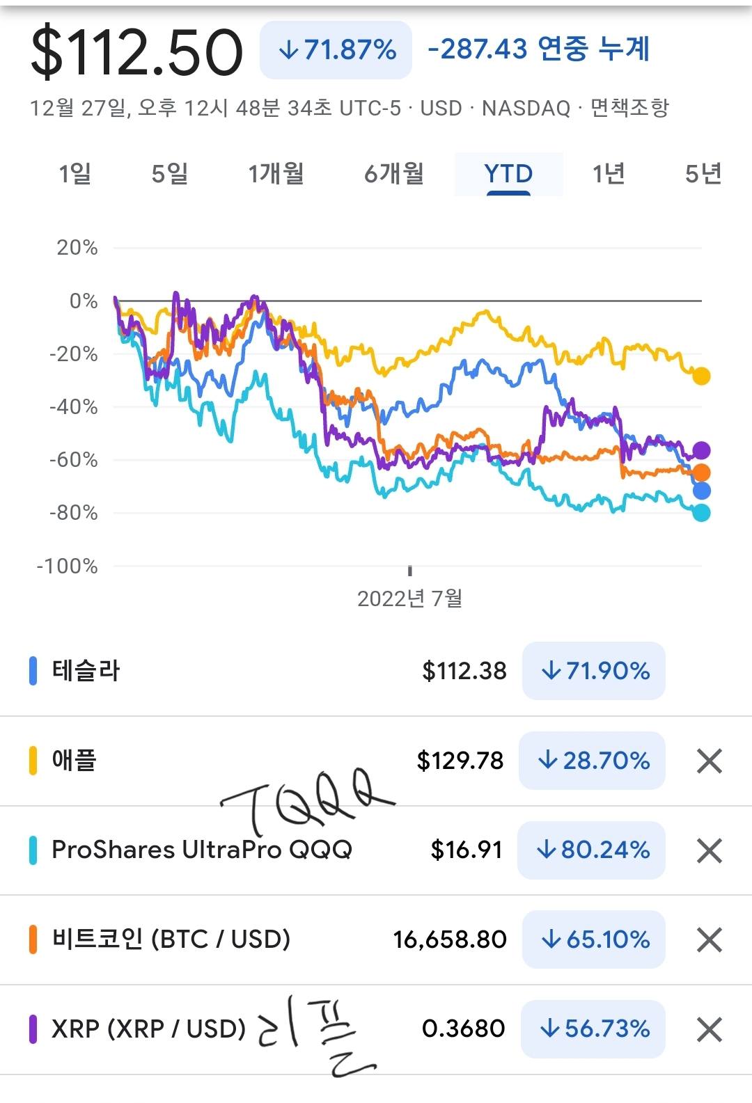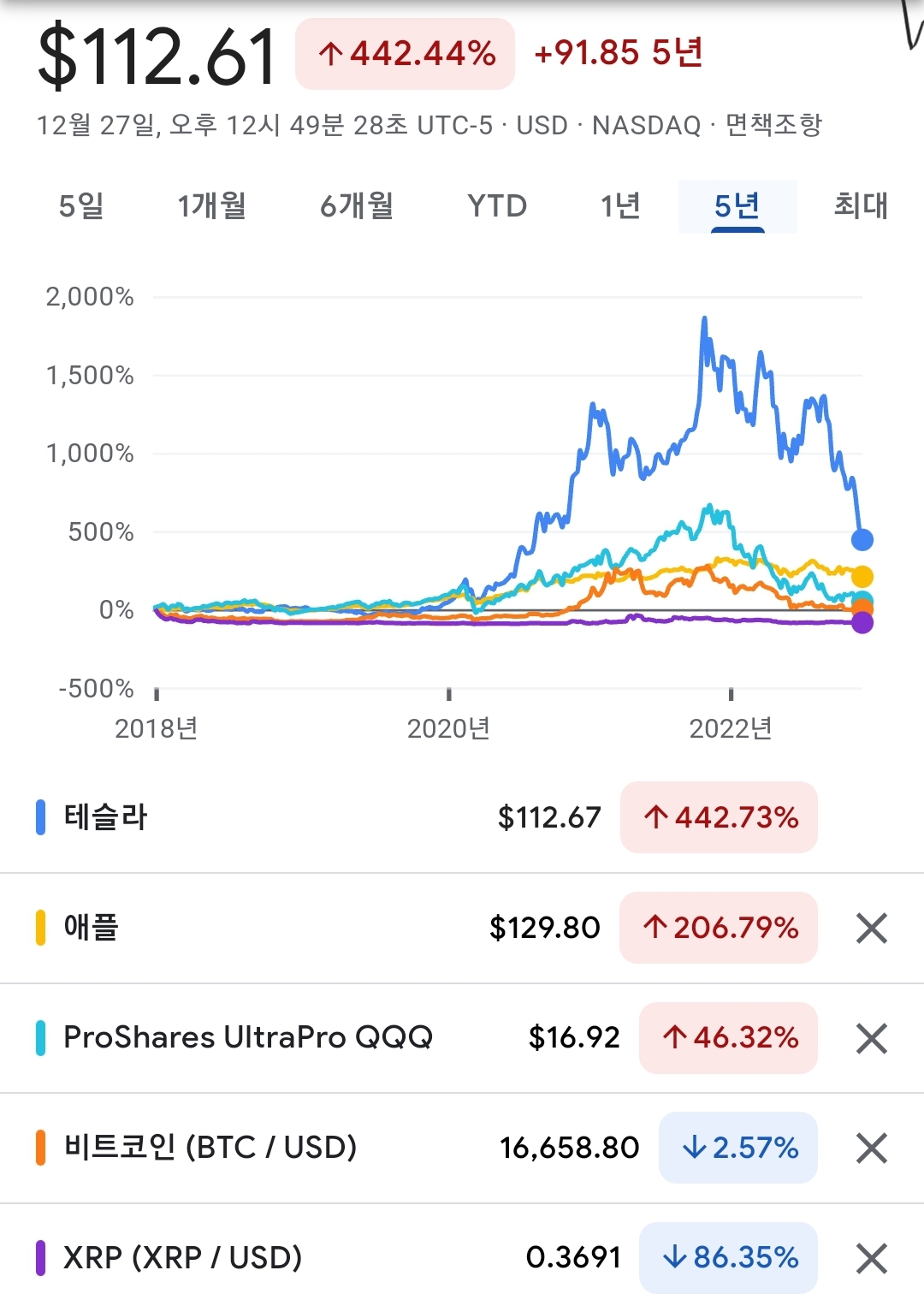 2022년 수익률비교 테슬라 리플 비트코인 tqqq xrp