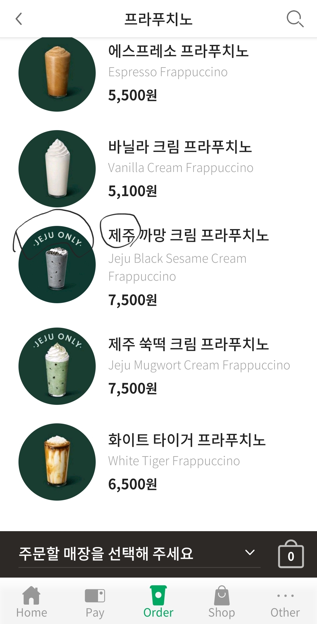 7500원 제주 까망 크림프라프치노