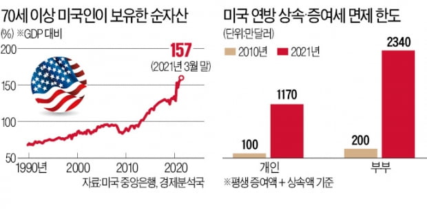 미국이 그동안 상속·증여세 면제 한도를 높여온 것도 이런 맥락에서다. 미 연방정부의 상속·증여세 면제 한도는 개인의 경우 2010년 100만달러(약 11억4000만원)에서 올해 1170만달러(약 133억원)로 늘었다. 부부는 이 기준이 같은 기간 200만달러에서 2340만달러(약 266억원)로 11.7배 높아졌다.