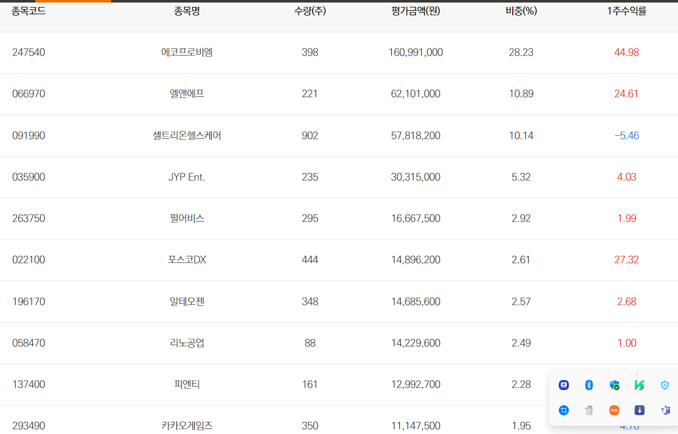 위 종목들이 보유비중 상위 주식 종목이고 전 종목은 맨위 링크에 있습니다.