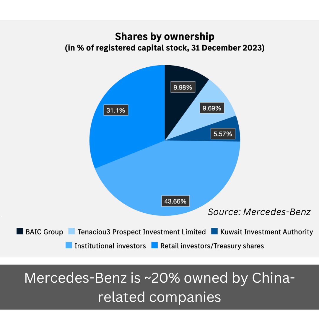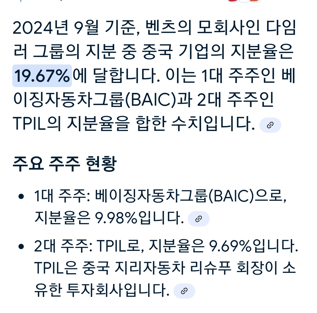 2024년 9월 기준, 벤츠의 모회사인 다임러 그룹의 지분 중 중국 기업의 지분율은 19.67%에 달합니다.